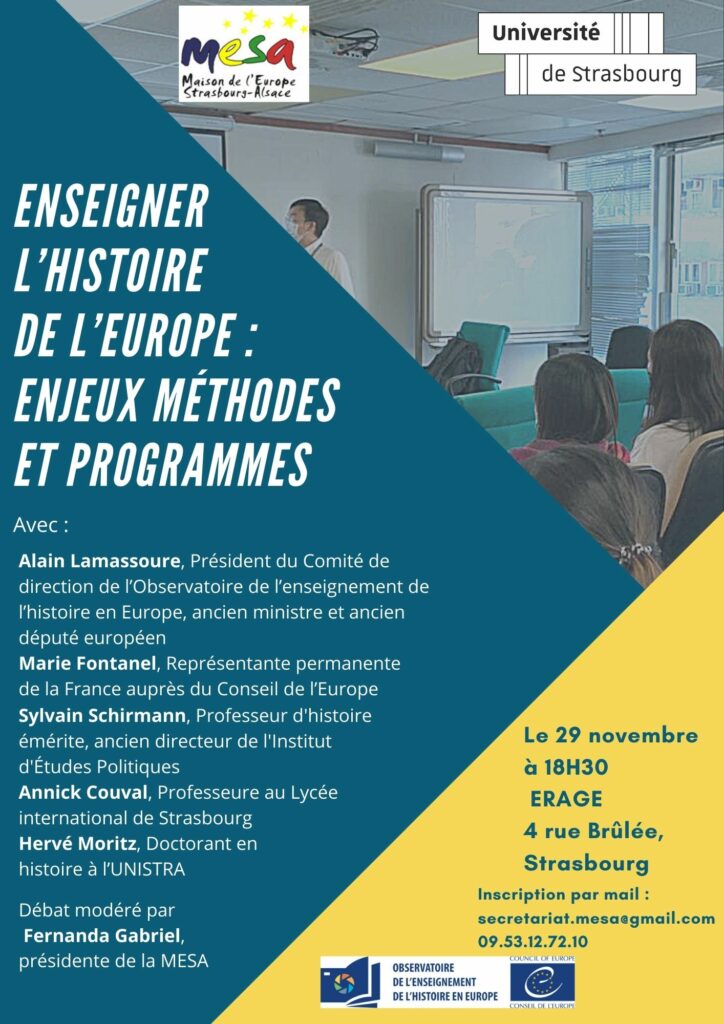 Le Président du Comité de direction de l’Observatoire de l’enseignement de l’histoire en Europe, ancien ministre et député européen, Alain Lamassoure, participera à notre conférence, Enseigner l’histoire de l’Europe : Enjeux méthodes et programmes, avec Sylvain Schirmann, professeur d’histoire émérite, ancien directeur de l’Institut d’Études Politique, Annick Couval, Professeure au Lycée international de Strasbourg, Marie Fontanel, représentante permanente de la France auprès du Conseil de l’Europe et Hervé Moritz, doctorant en histoire à l’UNISTRA. Le débat sera modéré par Fernanda Gabriel, Présidente de la MESA