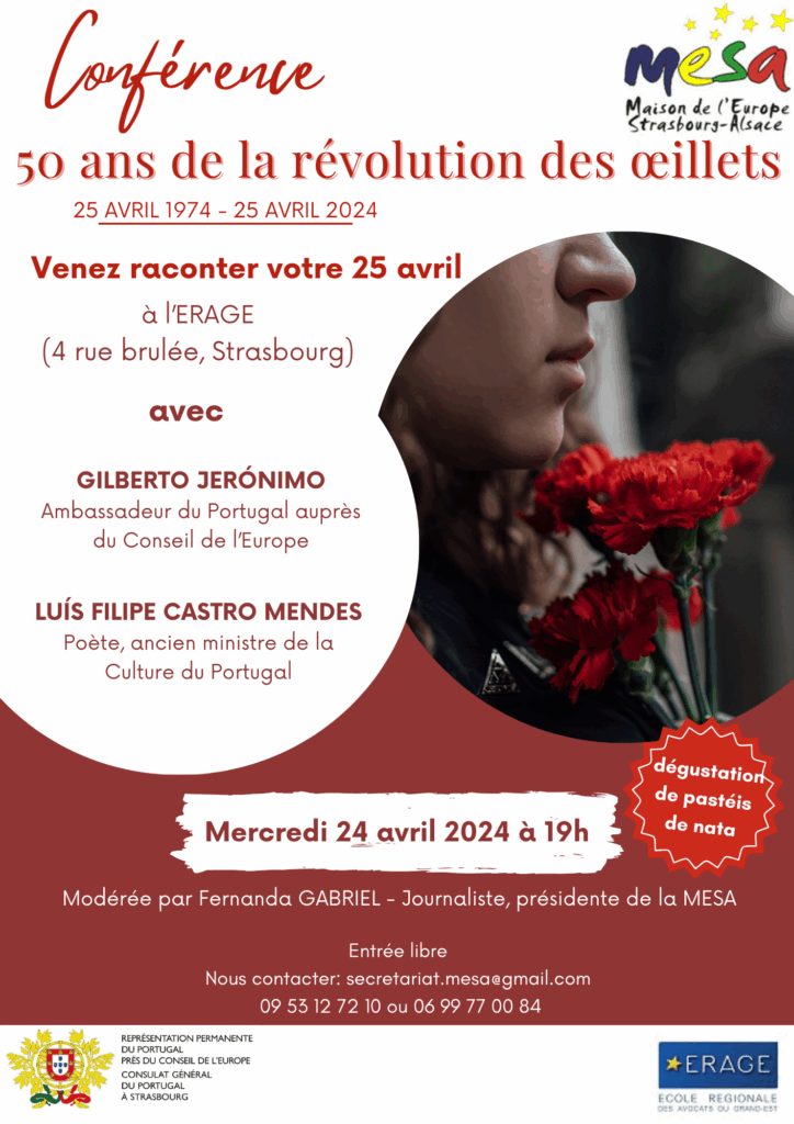 Ce fut une conférence à l’occasion du 50e anniversaire de la révolution portugaise des œillets avec Gilberto Jerónimo, ambassadeur du Portugal auprès du Conseil de l’Europe et Luis Filipe Castro, poète et ancien ministre de la Culture du Portugal.
